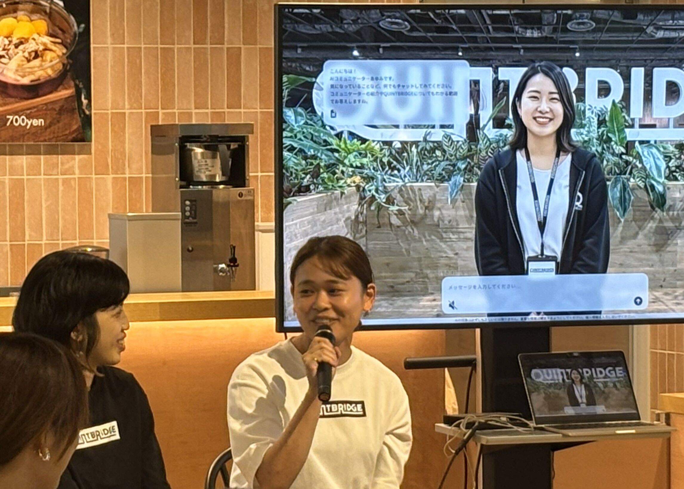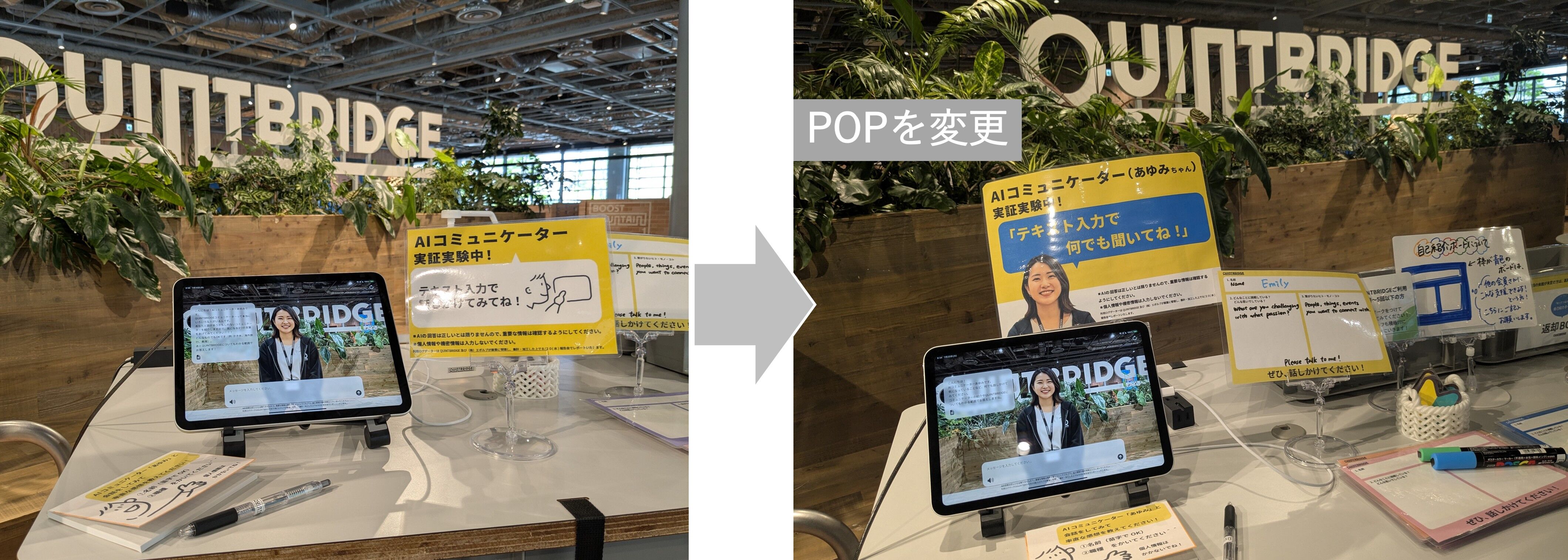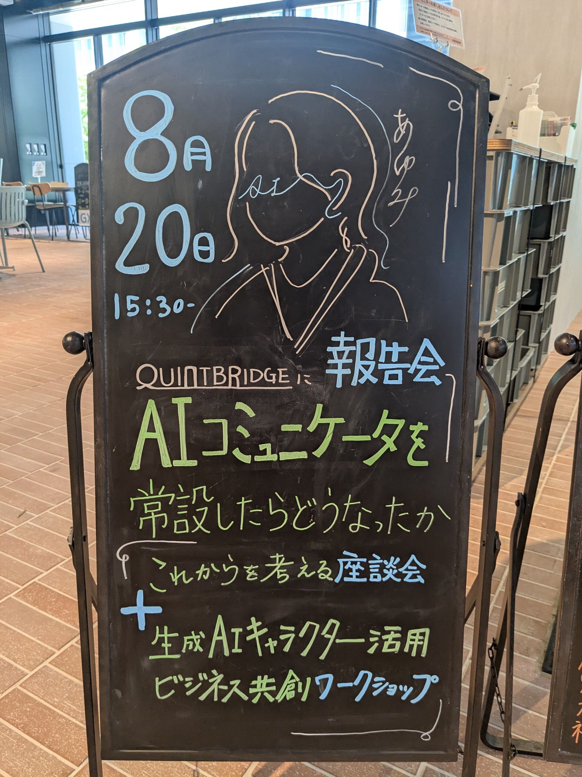 2025年7月14日、QUINTBRIDGEの館内5カ所に、AIコミュニケーター「あゆみちゃん」が常設された。設置されたのは、受付横、カフェ前、カウンターテーブル、2Fのブース前、そして1Fのテーブル席付近。iPadに表示されたアバターが、まるでスタッフの一員のように、日々来館者を迎える——そんな光景を想定していた。