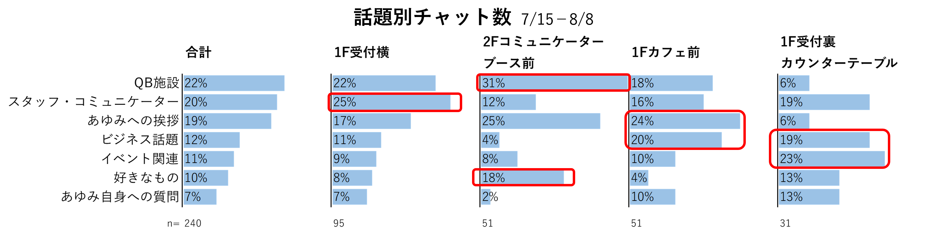 また、設置場所によって話される内容に傾向が見られ、1F受付横では「スタッフ・コミュニケーター」、カフェ前では「ビジネス話題」や「挨拶」などが多かった。