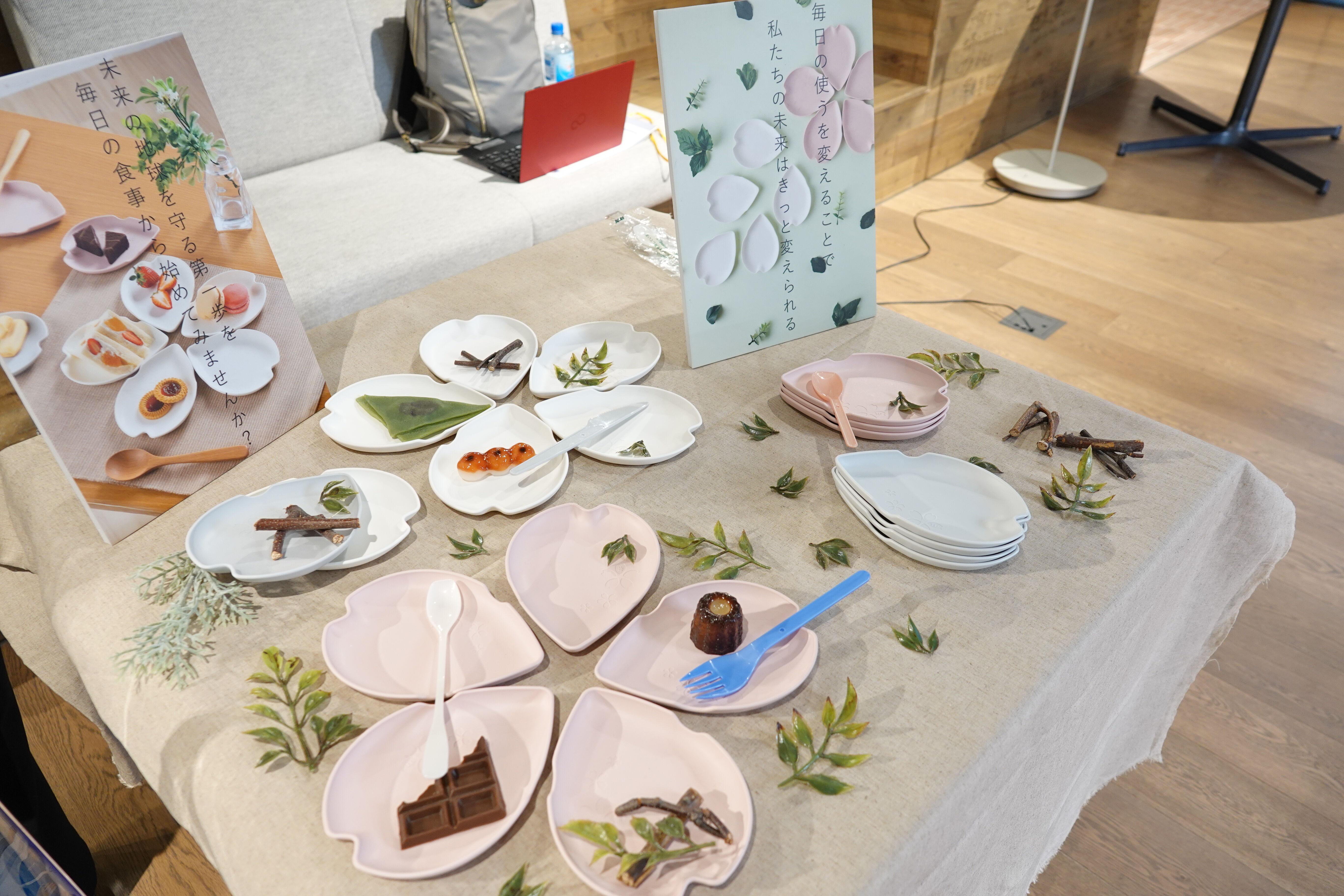 | 多田プラスチック工業株式会社 | 100%バイオマス由来でできた、土の中でも海の中でも微生物が分解する、自然に還る素材の桜のお皿の展示 |
