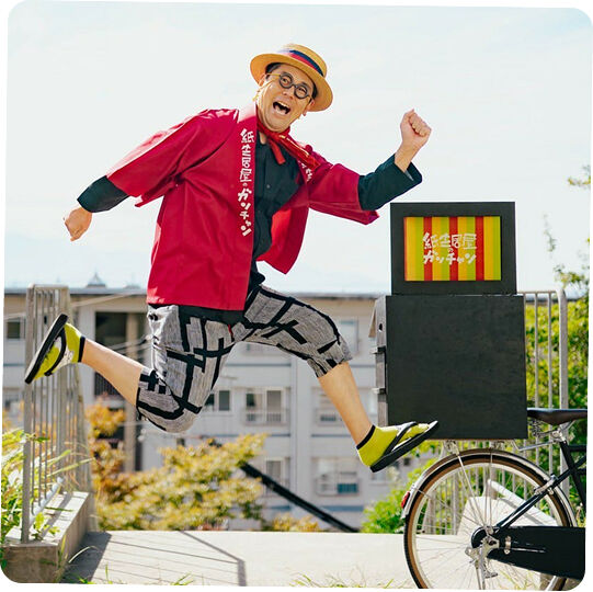 ニッポン全国街頭紙芝居大会2018大賞受賞。全国のイベントなどで活動している昔ながらのスタイルの紙芝居屋さん。演目は全てオリジナルの紙芝居。子どもからお年寄りまで幅広く楽しめるバカバカしく面白く、でも最後にちょっと何かが心に残る作品。今までに作成したオリジナル紙芝居は400作を超える(たぶん世界一)。アメリカ、メキシコ、台湾、ベトナムなど海外のイベントにも招待されるなど、紙芝居を通じての国際交流にも力を入れている。代表理事を務める一般社団法人 社会の窓社では、紙芝居屋の育成やサポート、紙芝居を通じての社会貢献、子ども達の発想力を引き出す活動なども行なっている。