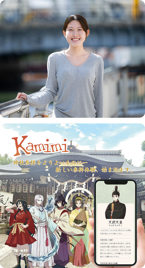 Kamimiは、神社に祀られる神様をキャラクターとして可視化し、“推し活”という親しみのある文脈を通して、神社や信仰文化に触れる入口をつくる取り組みです。