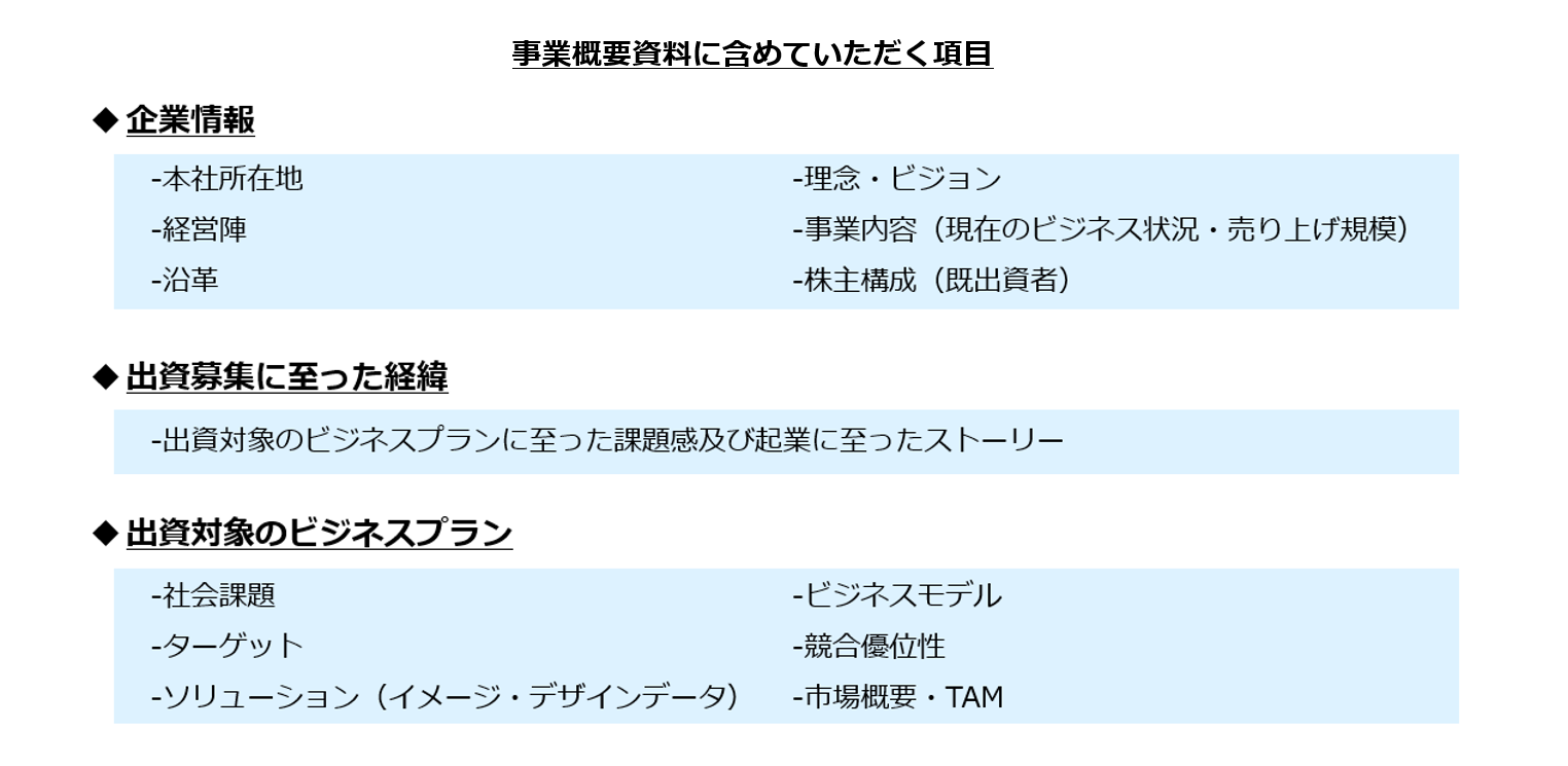 以下の内容が記載された事業概要資料をご提出ください。