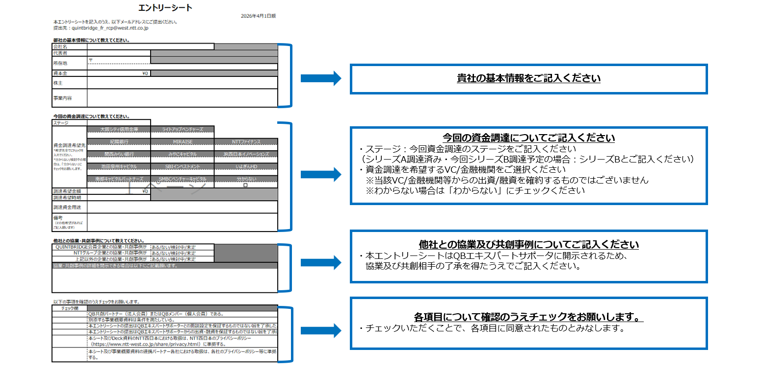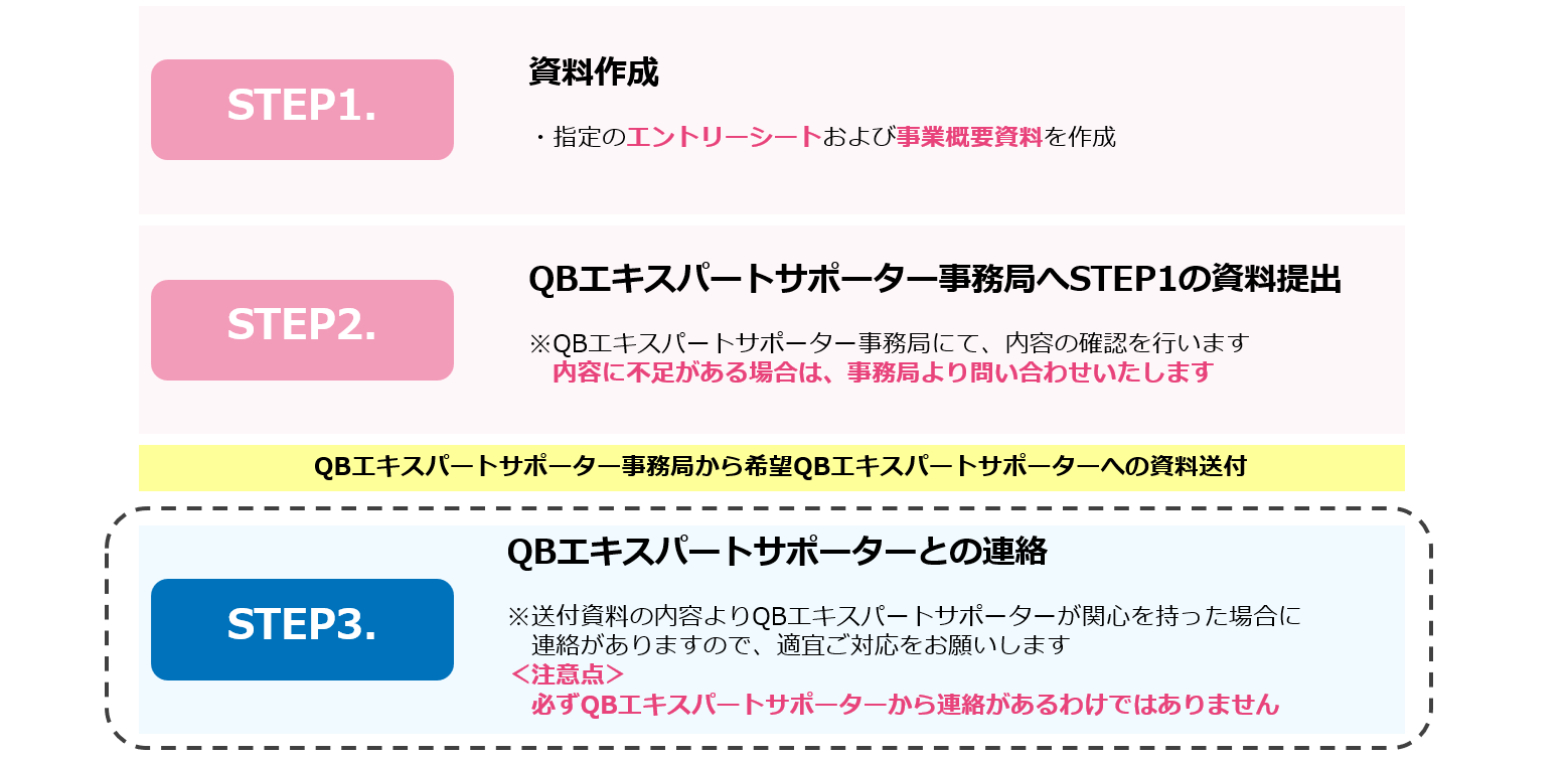 作成した ①エントリー資料 ②事業概要資料をQBエキスパートサポーター事務局へ送付願います。