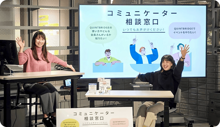 たまだコミュニケーターが常駐し、施設の使い方やおすすめイベントのご紹介、事業についてのご相談を受け付けています。QBを活用して事業をブラッシュアップしたい、こんな人と繋がりたい等、お気軽にお声掛けください!